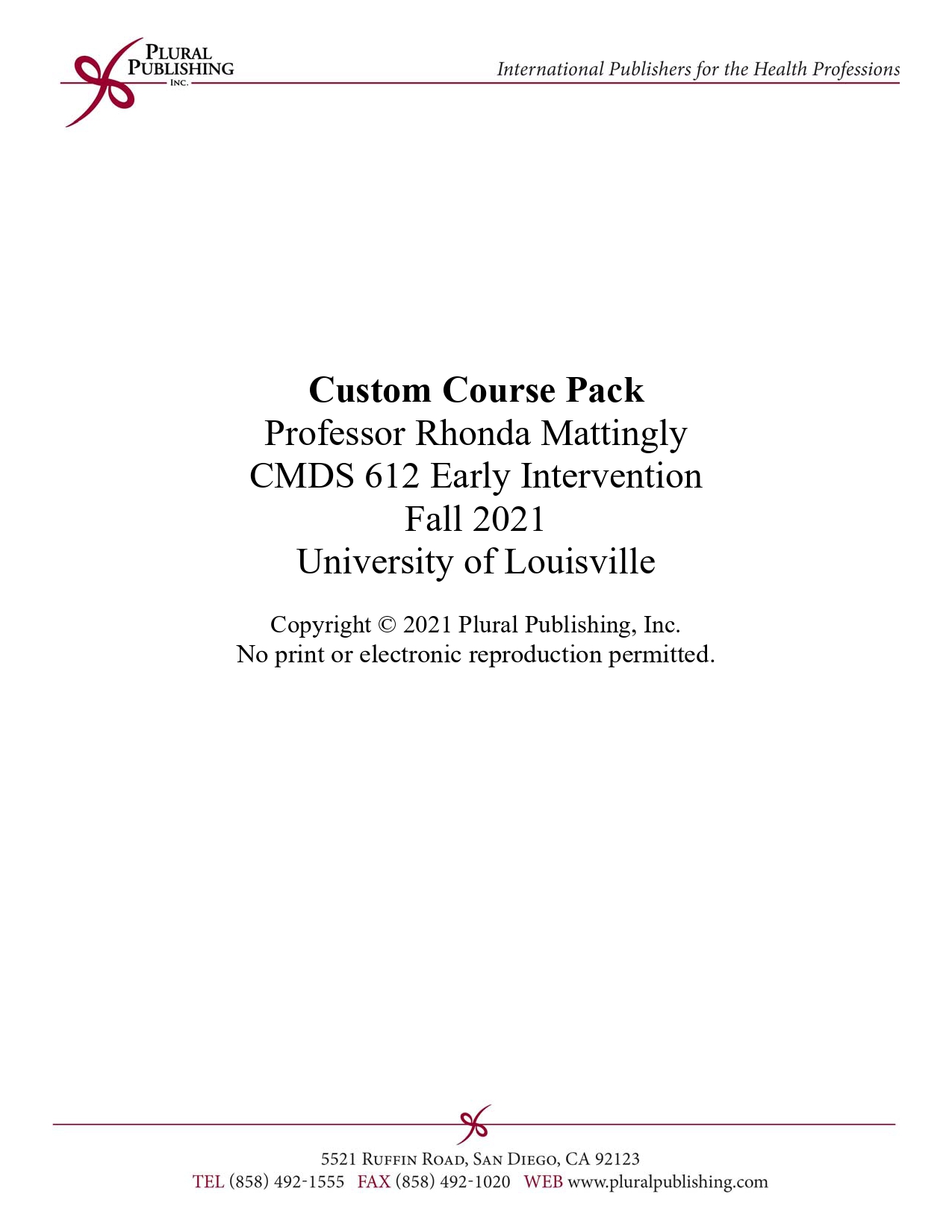 To order your course pack for CMDS 612 Early Intervention (Fall 2021), add to cart above and complete your transaction. You will be emailed an access code which you will need to register on the companion website link above to access your course pack.